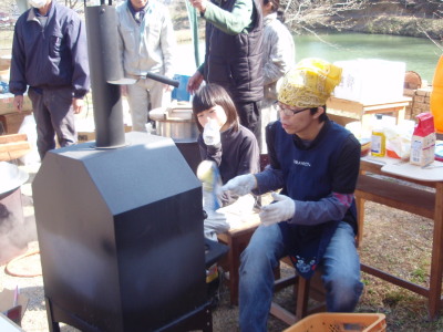 午前10時になると続々と若い親子連れが到着、巣箱作りやシイタケの菌打ち、草木染め、竹パン作りなどに挑戦していた。